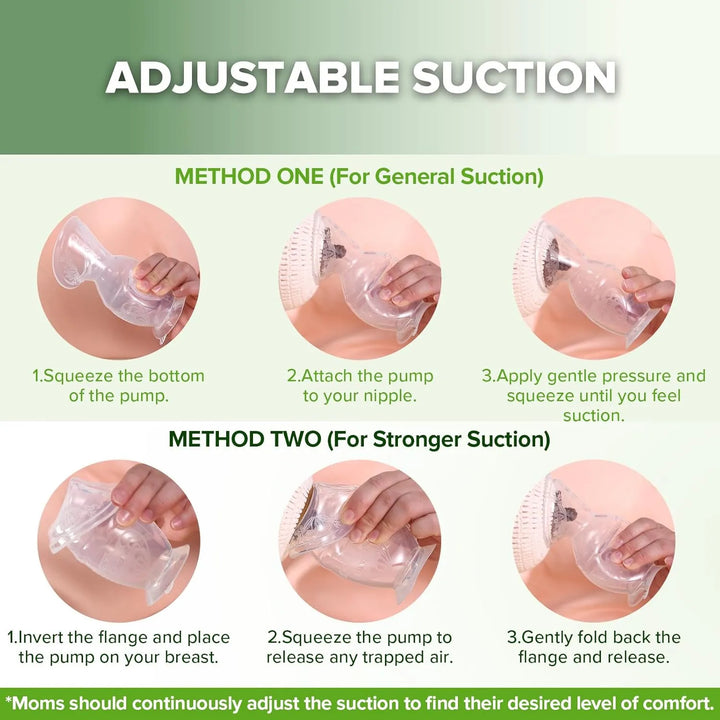 El extractor utiliza succión natural generada al presionar suavemente la base de silicona y colocarlo sobre el pecho. La presión negativa creada extrae la leche sin esfuerzo, imitando la succión del bebé. Es perfecto para usar durante la lactancia o en cualquier momento del día.
