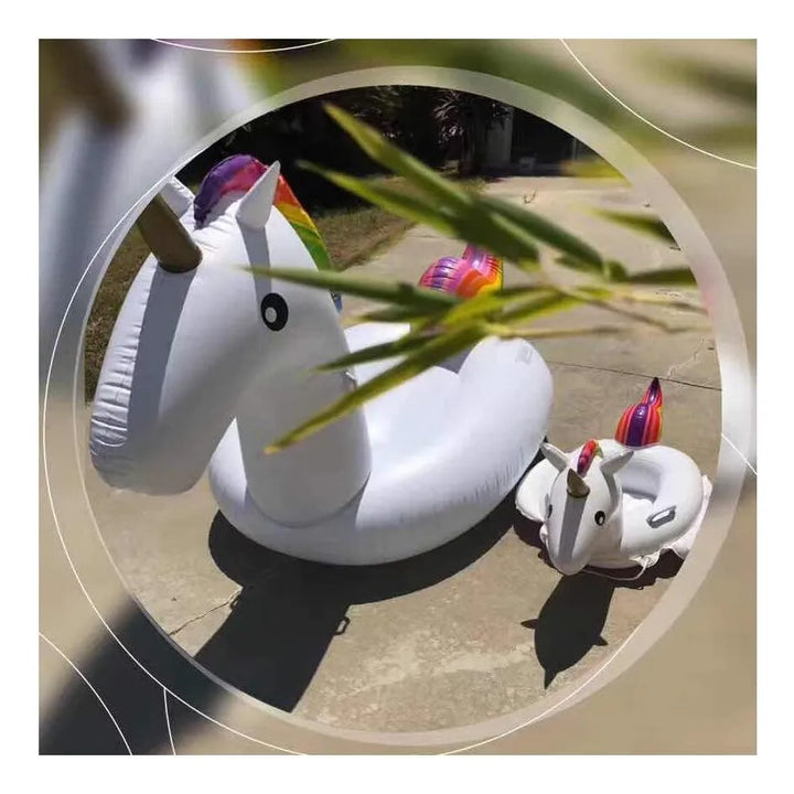 El flotador unicornio está diseñado para proporcionar seguridad y diversión en el agua. Su estructura inflable con múltiples cámaras de aire garantiza flotabilidad incluso si una de ellas pierde aire. Las asas permiten que el bebé se sujete con facilidad, mientras que la cuerda de seguridad ayuda a los padres a mantener el control.