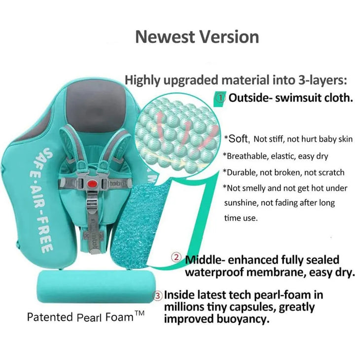 Este flotador utiliza un sistema de flotación pasiva gracias a su espuma de perla de última generación, que proporciona un soporte constante sin necesidad de inflado. La cola actúa como estabilizador, distribuyendo el peso del bebé para evitar volcaduras, mientras que las correas ajustables aseguran un ajuste cómodo y seguro.