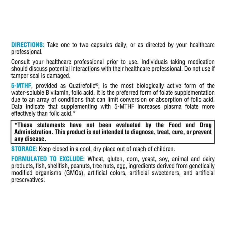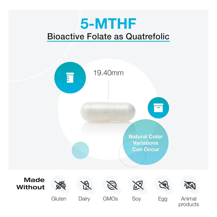 El 5-MTHF (L-metilfolato) es la forma activa de folato que participa directamente en el ciclo de metilación, un proceso fundamental para la producción de energía, la desintoxicación y la síntesis de ADN. Al tomar este suplemento, estás proporcionando a tu cuerpo el folato en su forma más biodisponible, listo para ser utilizado inmediatamente en estos procesos vitales.