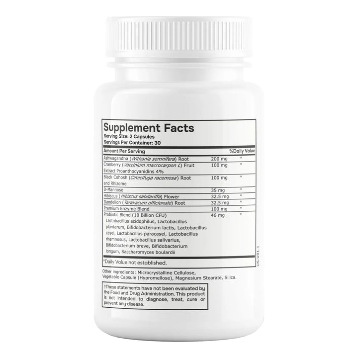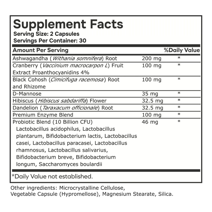 Nuestra fórmula probiótica actúa directamente en tu microbioma, repoblando las bacterias beneficiosas que tu cuerpo necesita. La Ashwagandha ayuda a reducir el estrés, mientras que el cohosh negro y el hibisco trabajan para equilibrar tus hormonas. La D-manosa y los arándanos protegen tu salud íntima, y el diente de león favorece una digestión óptima. Juntos, estos ingredientes crean un entorno interno saludable que te hará sentir renovada.