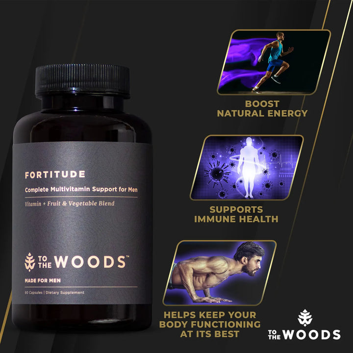 Fortitude Soporte multivitamínico completo para hombres, 20 frutas y verduras crudas orgánicas, 24 vitaminas y minerales esenciales, salud inmunológica, refuerzo de energía 1 botella,