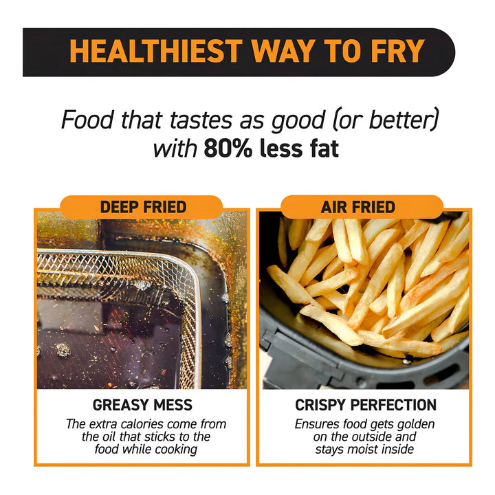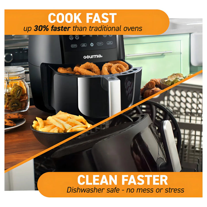 La freidora de aire Gourmia utiliza tecnología de circulación de aire caliente a alta velocidad para cocinar los alimentos de manera uniforme, creando ese exterior crujiente que todos amamos sin necesidad de sumergirlos en aceite. El resultado: comidas más saludables con todo el sabor y textura de las frituras tradicionales.