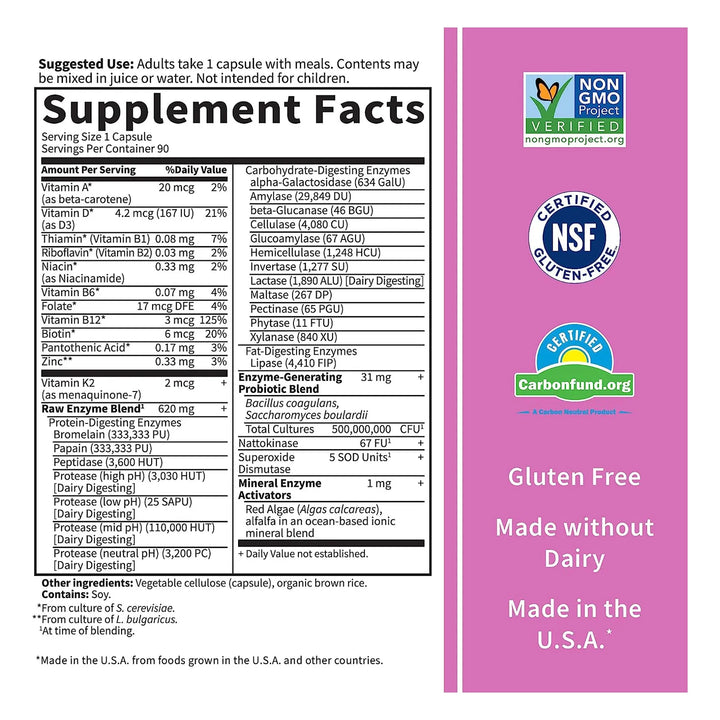 Imagina disfrutar de tus comidas favoritas sin preocuparte por la pesadez o la indigestión. Con una mezcla única de 22 enzimas digestivas, probióticos y vitaminas esenciales, este producto ayuda a descomponer los alimentos difíciles de digerir, apoyando la salud intestinal, ósea e inmunológica. Además, está formulado con ingredientes crudos y sin procesar, preservando su potencia natural para que tu cuerpo absorba cada nutriente al máximo.