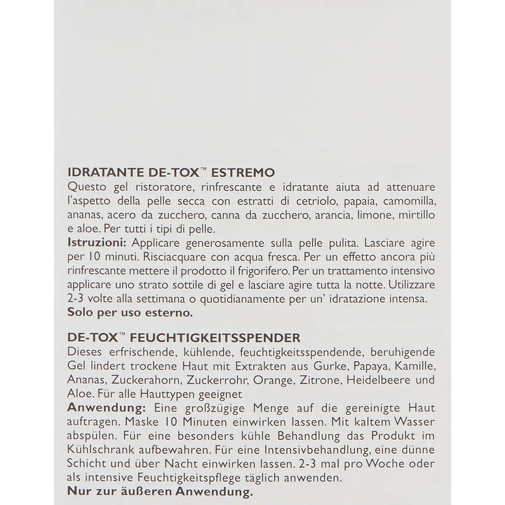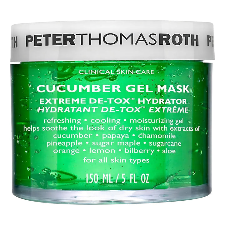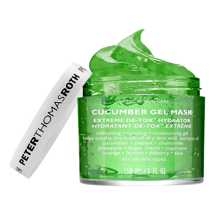 ¿Tu piel está cansada, deshidratada o irritada después de un día bajo el sol o un tratamiento facial? Descubre el Gel de Pepino Extreme De-Tox de Peter Thomas Roth, una solución refrescante y reparadora que devuelve a tu piel su equilibrio natural. Con una fórmula enriquecida con extractos de pepino, aloe vera y frutas como la papaya y el limón, este gel no solo calma al instante, sino que también hidrata en profundidad y elimina toxinas para un cutis radiante y saludable.