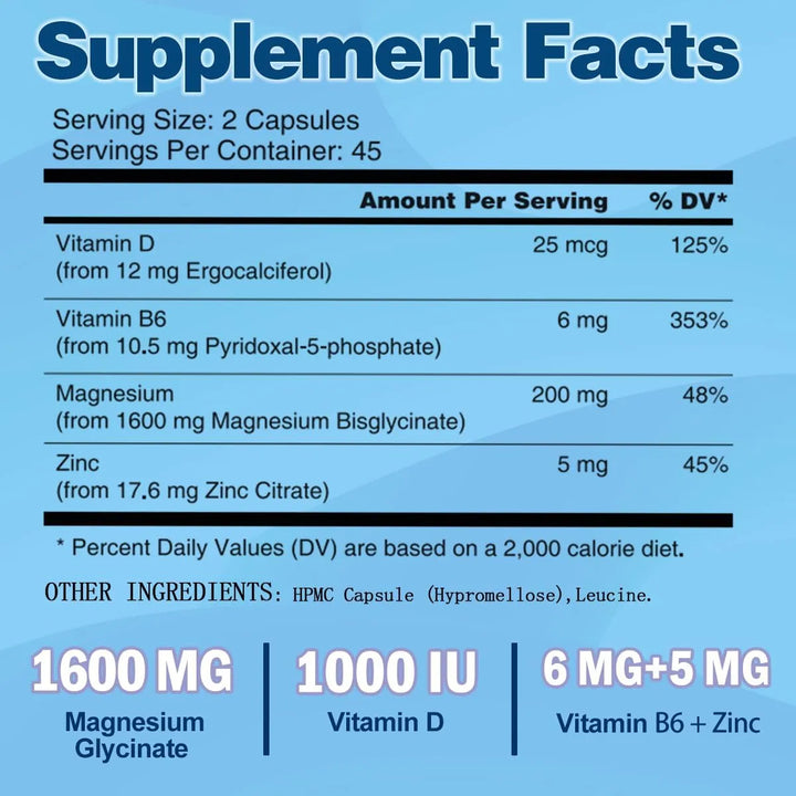 El glicinato de magnesio actúa directamente en tu sistema nervioso, promoviendo la relajación muscular y mental. La vitamina B6 ayuda a que el magnesio se absorba mejor, mientras que el zinc y la vitamina D3 refuerzan tu sistema inmunológico y la salud ósea. Es como un equipo de élite trabajando para que te sientas mejor cada día.
