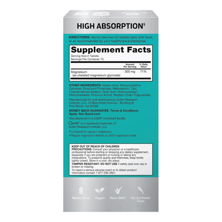 El Glicinato de Magnesio 300 mg de Qunol es un suplemento de alta calidad diseñado para restaurar tus niveles de magnesio de manera efectiva y segura. A diferencia de otras formas de magnesio que pueden causar malestar estomacal, nuestro producto utiliza glicinato de magnesio quelatado, la forma más biodisponible y gentil con tu sistema digestivo.