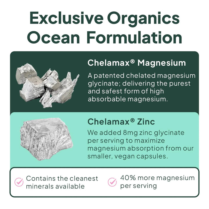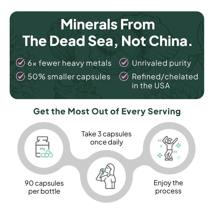 Extraído del Mar Muerto, conocido por su riqueza mineral, nuestro magnesio y zinc son cuidadosamente procesados para ofrecerte la máxima pureza y absorción. Con una fórmula que contiene 6 veces menos metales pesados que otros suplementos, tu cuerpo lo digerirá fácilmente, sin malestares. ¿Por qué conformarte con menos cuando puedes tener lo mejor?
