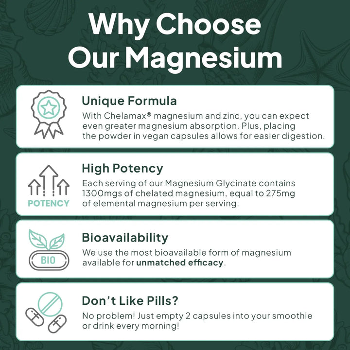 El Glicinato de Magnesio actúa directamente en tu sistema nervioso, promoviendo la relajación muscular y mejorando la calidad del sueño. Al combinarse con zinc, potencia sus beneficios, apoyando la función cardíaca y reduciendo la fatiga. Su fórmula quelada asegura que el 100% de los nutrientes sean absorbidos por tu cuerpo, sin desperdiciar ni una gota de su potencial.