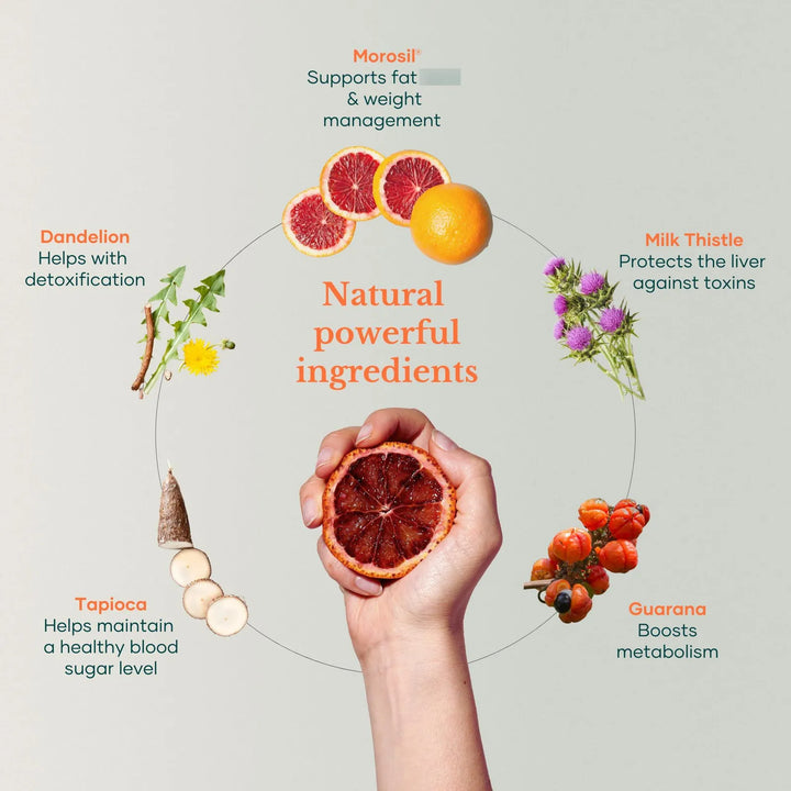 Con ingredientes cuidadosamente seleccionados, como el extracto de naranja sanguina enriquecido con biofenoles y el guaraná, conocido por acelerar el metabolismo hasta un 311% durante 12 horas, este producto es tu aliado perfecto para alcanzar tus metas de bienestar. Además, la hoja de diente de león, rica en vitaminas y minerales esenciales, fortalece tu sistema inmunológico mientras cuida de tu salud hormonal. No se trata solo de un suplemento, es una experiencia de autocuidado que te empodera cada día.