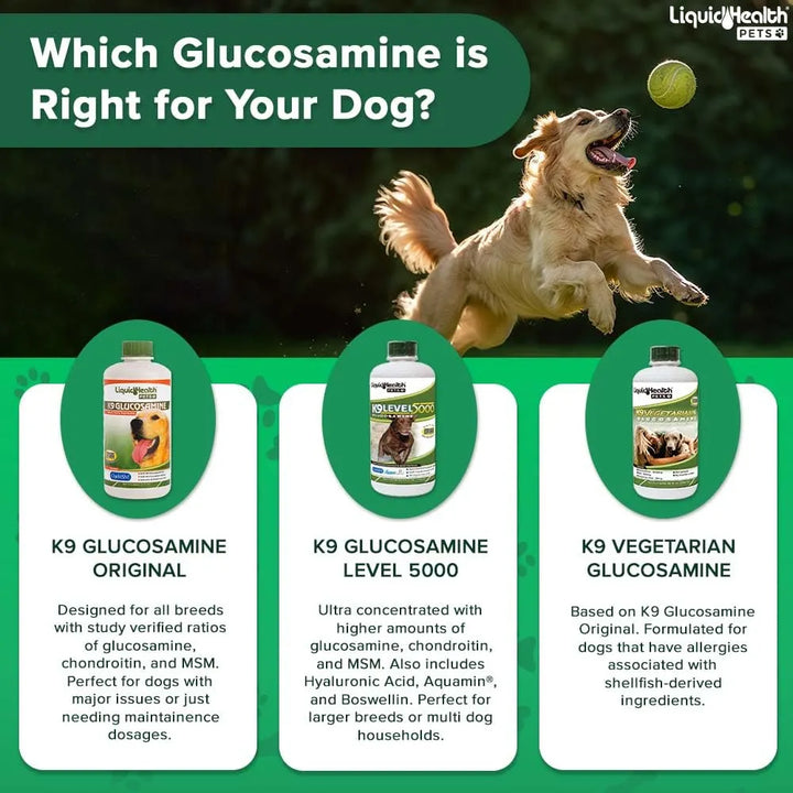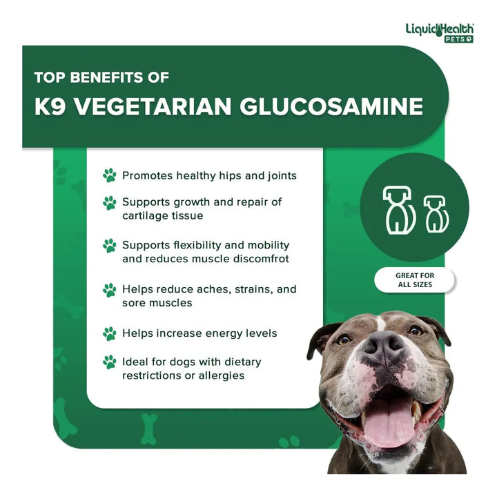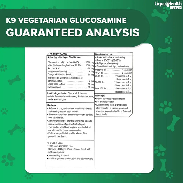 Componentes incluidos: Glucosamina vegetariana K9 (anteriormente glucosamina K9 y HA) por Liquid Health - 32 oz.