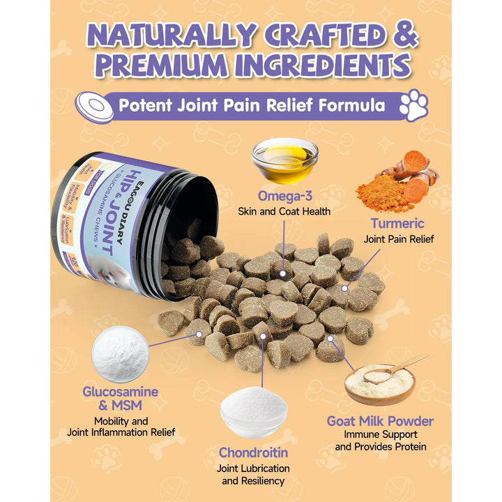 ¿Tu perro ya no corre con la misma energía? ¿Notas que le cuesta levantarse o subir escaleras? El dolor articular puede robarle la alegría a tu mejor amigo, pero hoy tienes la solución. Nuestra Glucosamina Masticable para Perros con Cúrcuma, Omega 3 y Leche de Cabra está diseñada para devolverle la vitalidad y el confort que merece. Con ingredientes 100% naturales y una fórmula avanzada, cada mordisco es un paso hacia una vida más activa y feliz.