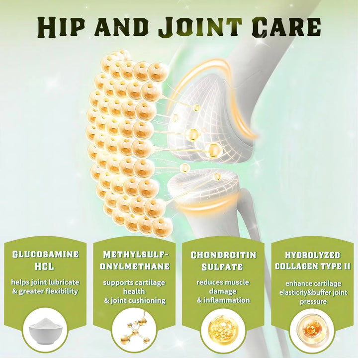 Imagina ver a tu compañero jugar como cachorro otra vez, sin quejas ni rigidez. Nuestra fórmula única combina los tres ingredientes más poderosos para la salud articular: glucosamina para lubricar las articulaciones, condroitina para proteger el cartílago y MSM para reducir la inflamación. Pero no nos detenemos ahí - añadimos una mezcla antiinflamatoria con omega 3, cúrcuma y mejillón de labios verdes para un alivio profundo y duradero.