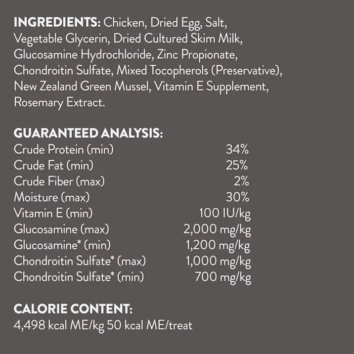 Imagina ver a tu perro disfrutar de un premio delicioso mientras cuidas su salud articular. Nuestras golosinas carnosas sin granos están diseñadas para perros de todas las edades, especialmente aquellos que necesitan un apoyo extra en sus articulaciones. Con ingredientes premium como pollo real como primer ingrediente, glucosamina, condroitina y Omega 3, cada bocado es un paso hacia una vida más activa y feliz para tu compañero peludo.