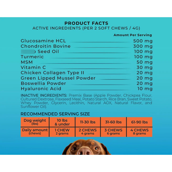 Imagina a tu compañero jugando como cachorro otra vez, sin quejas ni rigidez. Con una mezcla formulada por expertos de 500 mg de glucosamina, condroitina, colágeno y cúrcuma, estas golosinas no solo alivian el dolor, sino que reconstruyen y protegen sus articulaciones desde dentro. Cada bocado es un paso hacia una vida más activa y feliz.