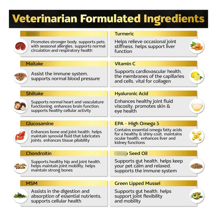 Imagina a tu peludo disfrutando de sus paseos favoritos sin molestias, volviendo a perseguir pelotas con ese brillo juguetón en los ojos. Estos suplementos no solo alivian el dolor, sino que protegen sus articulaciones a largo plazo, gracias a una fórmula única con glucosamina, condroitina, cúrcuma y ácido hialurónico. Cada mordisco es un paso hacia una movilidad renovada y una vida más activa.