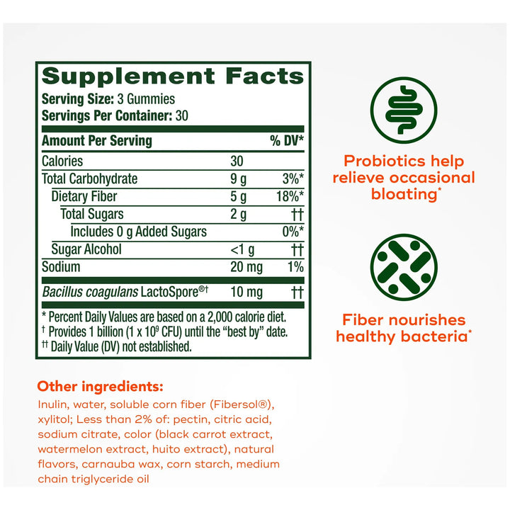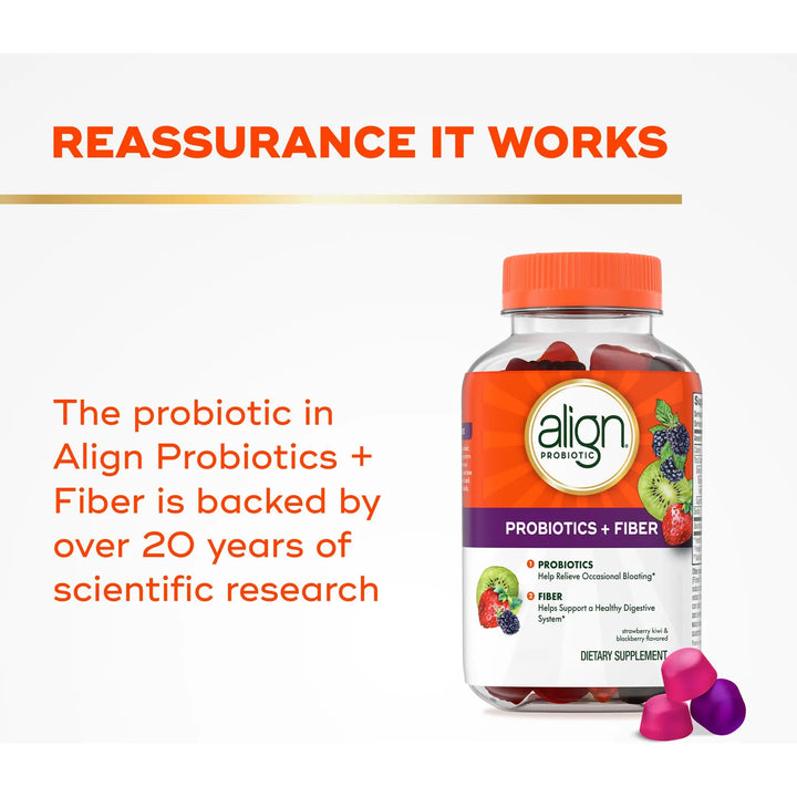 Las gomitas Align Probiotics Fiber trabajan desde el primer momento en que las consumes. Los probióticos añaden bacterias beneficiosas a tu intestino, ayudando a equilibrar tu flora intestinal y reduciendo la hinchazón ocasional. La fibra actúa como un prebiótico, alimentando estas bacterias buenas para que prosperen y apoyen un sistema digestivo saludable. Juntos, forman un equipo imparable para tu bienestar digestivo.