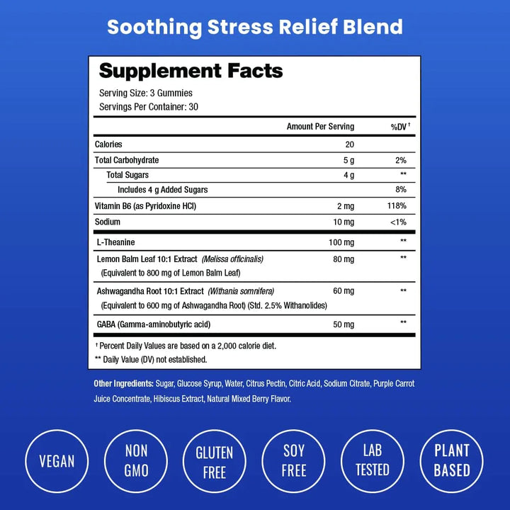 Formuladas con Ashwagandha, L-teanina, GABA, vitamina B6 y bálsamo de limón, estas gomitas no solo son deliciosas, sino que también están respaldadas por la ciencia. Cada ingrediente ha sido cuidadosamente seleccionado para ofrecerte un alivio efectivo del estrés, ayudándote a mantener la calma y la claridad mental en tu día a día.