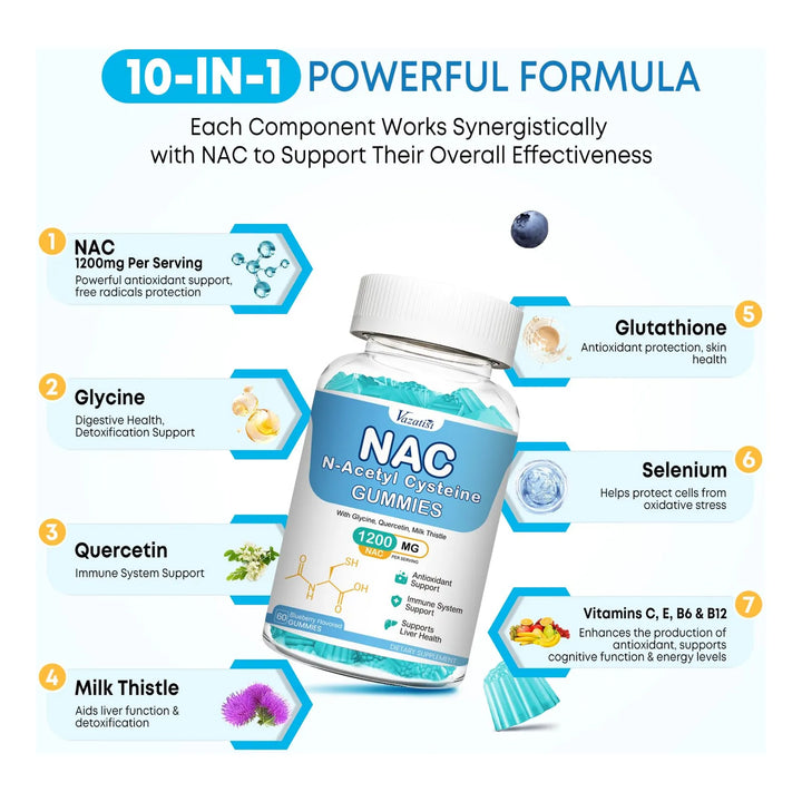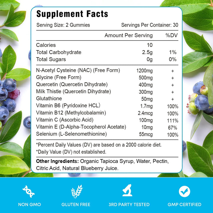 Imagina despertar cada día con más energía, sintiendo que tu cuerpo está protegido contra los radicales libres y que tu sistema inmunológico está fortalecido. Con 600 mg de NAC por gomita, este producto es tu aliado para una vida más saludable y equilibrada. Su combinación única de ingredientes como glutatión, quercetina y vitaminas esenciales trabaja en sinergia para apoyar tu salud hepática, respiratoria y celular.