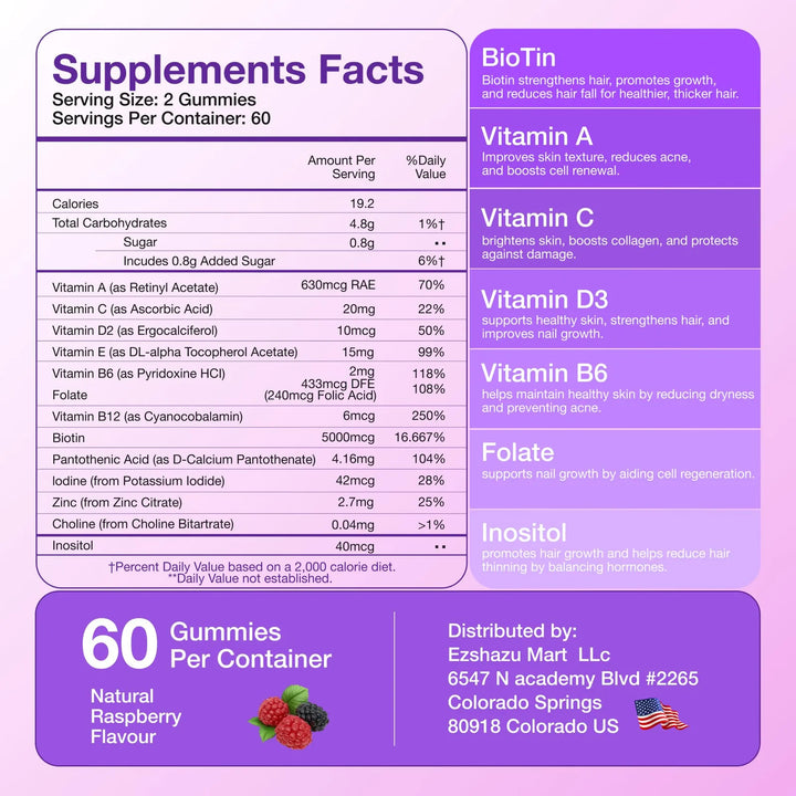 ¿Sueñas con un cabello más largo, fuerte y lleno de vida? ¿Quieres lucir una piel radiante y uñas que no se rompan al primer descuido? Las gomitas de biotina 5000 mcg están diseñadas para ayudarte a lograr esos resultados de manera deliciosa y efectiva. Con una fórmula vegana y potente, estas gomitas son tu aliado perfecto para una belleza desde adentro.