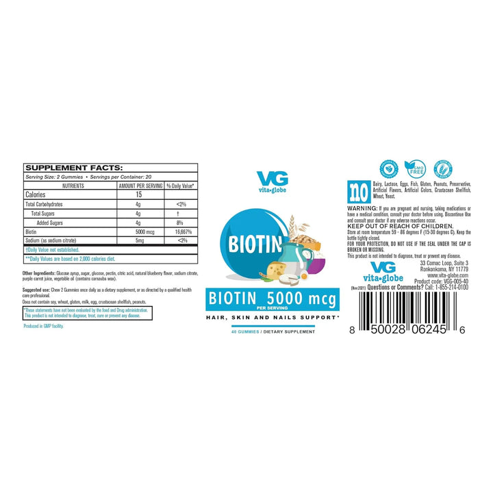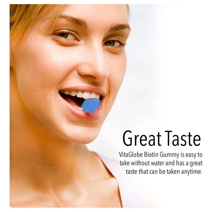 ¿Sueñas con un cabello más fuerte, una piel luminosa y uñas que no se rompen? Las gomitas de biotina VitaGlobe son tu solución. Con 5000 mcg de biotina por porción, este delicioso suplemento en forma de gomita te ayuda a lucir tu mejor versión cada día. No más productos que prometen y no cumplen: estos son resultados reales, en un formato fácil y delicioso.
