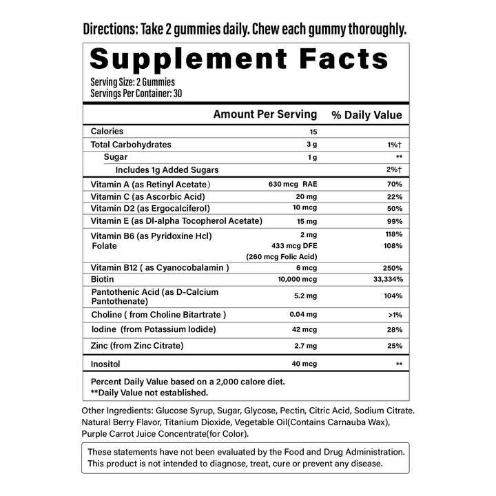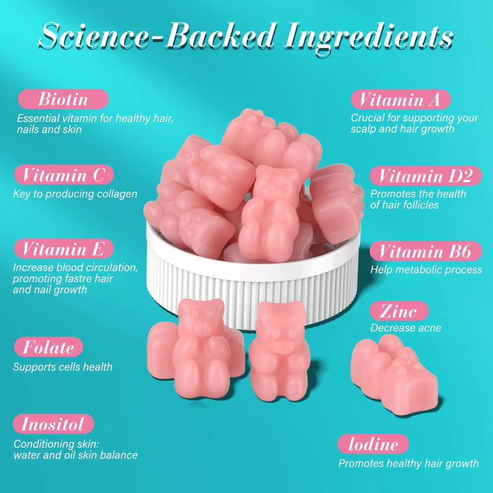 - 🌿 Cabello más largo y fuerte: La biotina y las vitaminas B estimulan el crecimiento natural, reduciendo la caída y dando volumen.