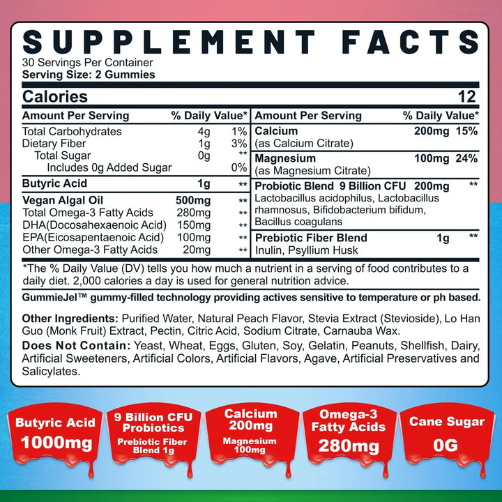 ¿Sufres de hinchazón, digestiones pesadas o desequilibrios en tu microbiota intestinal? Las gomitas de butirato con Omega 3, probióticos y fibra prebiótica son la solución que estabas buscando. Diseñadas para apoyar tu bienestar digestivo de manera deliciosa y efectiva, estas gomitas combinan ingredientes clínicamente respaldados en un formato fácil de tomar y con un sabor a melocotón que te encantará.