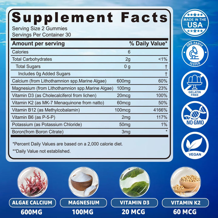 Imagina poder disfrutar de un suplemento que no solo te brinda calcio, sino que también incluye vitamina D3 y magnesio para una absorción óptima. Estas gomitas están hechas con algas oceánicas orgánicas, una fuente sostenible y natural de minerales. Con un 60% más de calcio elemental que el carbonato de calcio tradicional, este producto te asegura que cada porción cuenta.