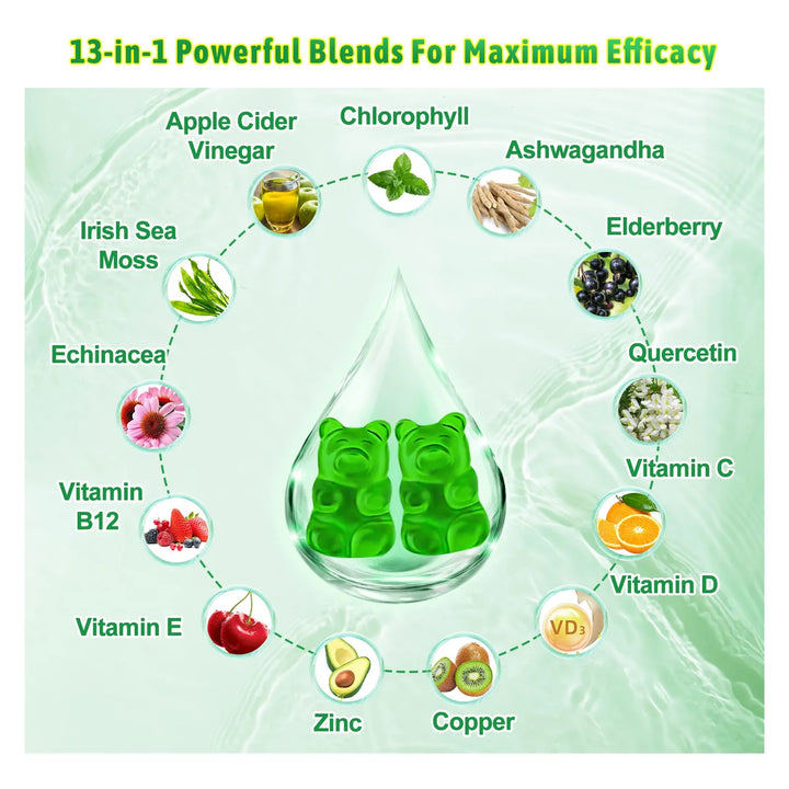 ¿Te preocupa el olor corporal o el mal aliento? Estas gomitas están diseñadas para combatir esos problemas de manera natural, gracias a su mezcla única de clorofila, ashwagandha y zinc. Además, su fórmula 13 en 1 incluye vitaminas esenciales como B12, C, D, E y minerales como zinc y cobre, que trabajan juntos para fortalecer tu cuerpo y mente.