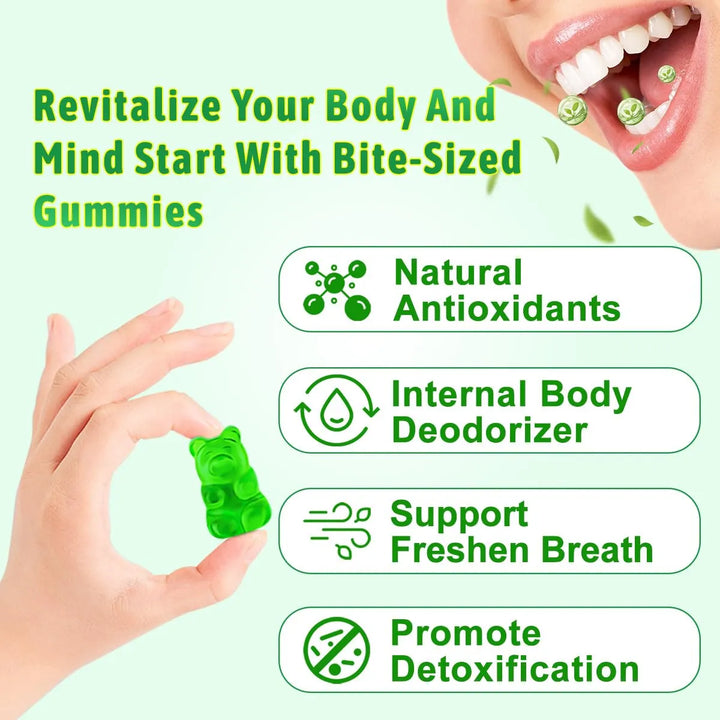 Las gomitas de clorofila actúan desde el primer momento que las consumes. La clorofila, extraída de hojas de morera, combate las toxinas en tu cuerpo, mientras que la ashwagandha reduce el estrés y el zinc fortalece tu sistema inmunológico. Juntos, estos ingredientes trabajan para eliminar el olor corporal, mejorar tu digestión y darte un impulso de energía duradero.