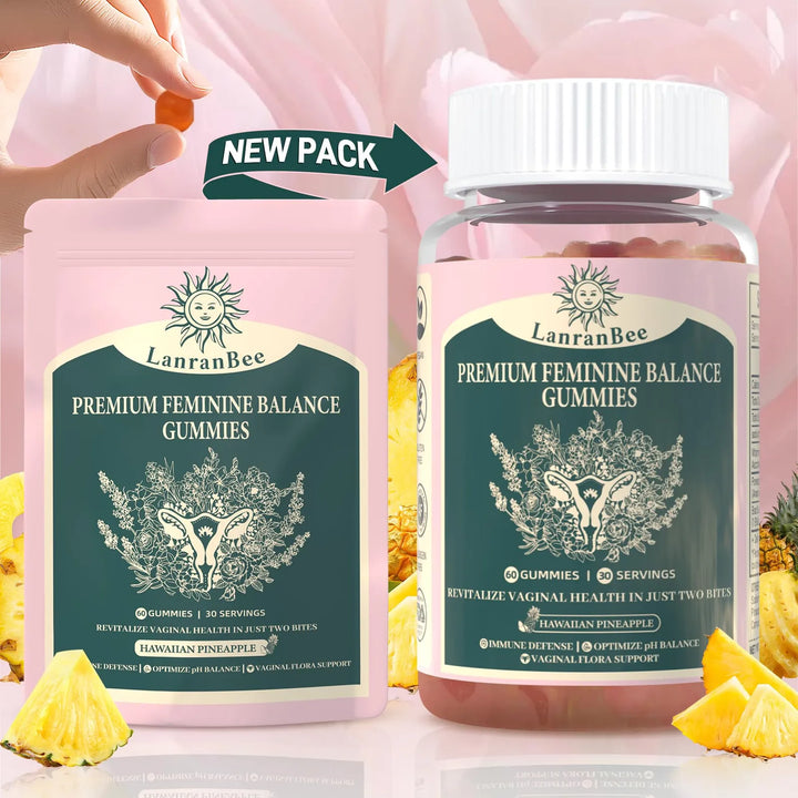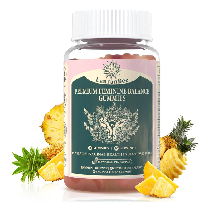 Nuestras Gomitas de Equilibrio Femenino Premium trabajan desde adentro para apoyar tu salud íntima. Los ingredientes naturales, como el polvo de piña y los coagulanos de bacilo, ayudan a mantener un equilibrio saludable del pH, fortalecen tu sistema inmunológico y promueven una flora vaginal saludable. Todo esto en un formato delicioso y fácil de tomar.