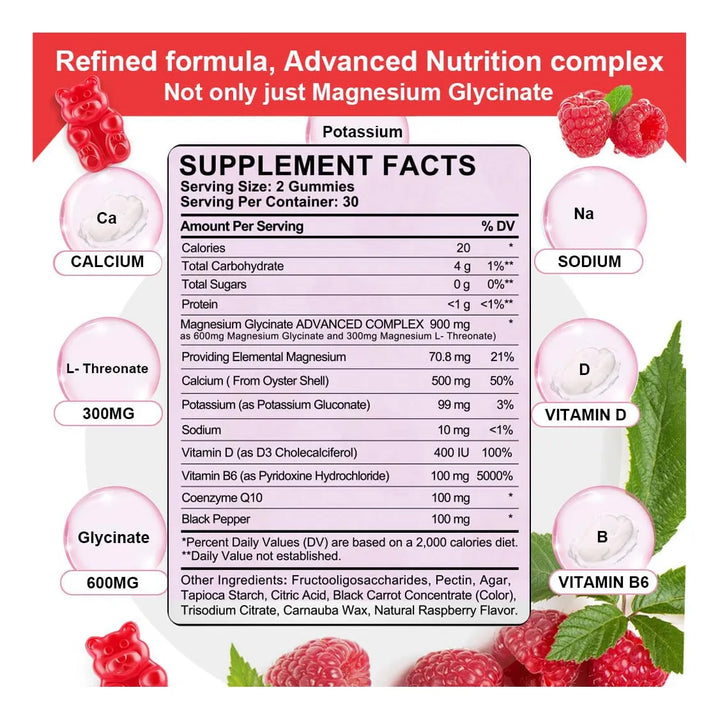 Estas gomitas no son un simple suplemento. Son una experiencia de cuidado personal en cada bocado. Con una mezcla única de 900 mg de magnesio (600 mg de glicinato y 300 mg de L-treonato), están diseñadas para apoyar tu cuerpo y mente de manera integral. ¿Lo mejor? Son tan deliciosas que olvidarás que estás tomando un suplemento.