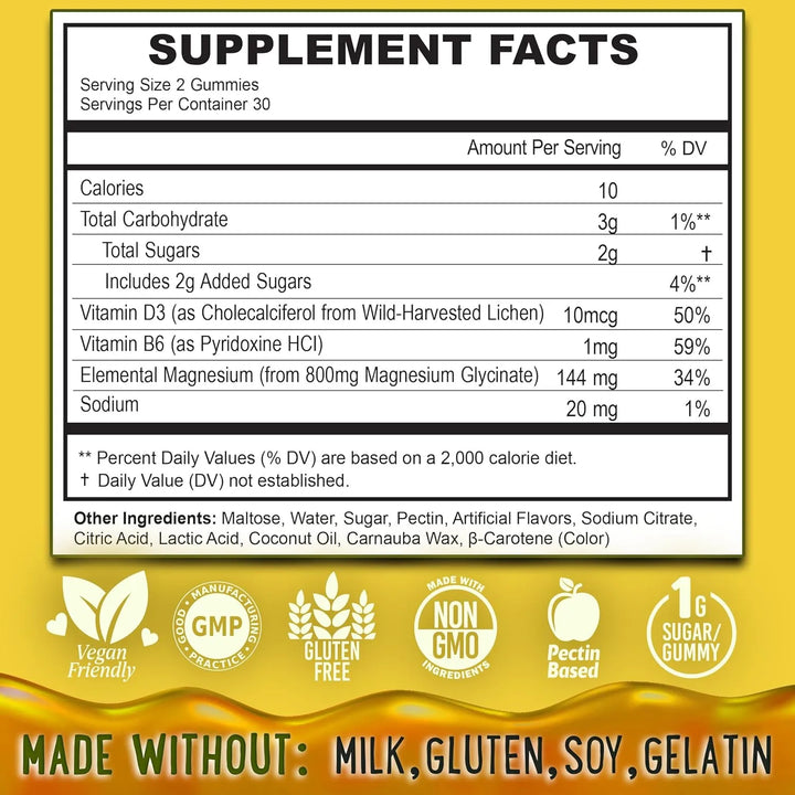 El glicinato de magnesio es una de las formas más absorbibles de magnesio, lo que significa que tu cuerpo lo aprovecha al máximo. Al combinarse con vitamina B6 y D3, se potencia su capacidad para regular el sistema nervioso, promover la relajación muscular y mejorar la calidad del sueño. Estas gomitas actúan suavemente, ayudando a equilibrar los niveles de estrés y apoyando la recuperación muscular después de la actividad física.