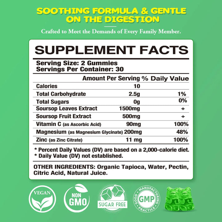 El secreto está en su composición natural. El extracto de hojas de guanábana (graviola) actúa como un potente antioxidante, neutralizando los radicales libres que aceleran el envejecimiento celular. La vitamina C y el zinc refuerzan tu sistema inmunológico, mientras que el magnesio contribuye al bienestar general. La fibra dietética promueve una digestión saludable, evitando molestias gastrointestinales.