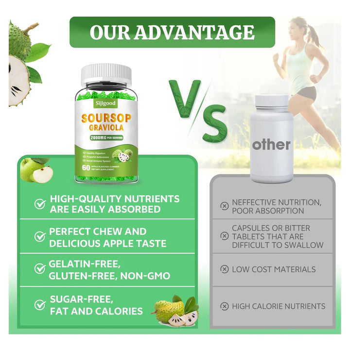 Imagina disfrutar de un producto delicioso que no solo satisface tu antojo de algo dulce, sino que también cuida de tu salud. Nuestras Gomitas de Guanábana Orgánica con Sabor a Manzana son la combinación perfecta entre sabor y bienestar. Cada bocado está diseñado para brindarte los beneficios de la graviola, una planta tropical conocida por sus propiedades antioxidantes, digestivas y de apoyo inmunológico.