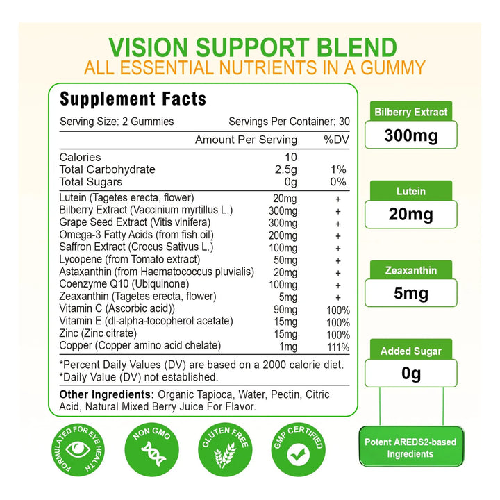 Imagina poder apoyar tu salud ocular con una fórmula completa que combina nutrientes esenciales como luteína, zeaxantina, vitaminas C y E, extracto de arándano y más. Estos ingredientes trabajan en sinergia para proteger tus ojos de la luz azul, mejorar la claridad visual y prevenir problemas relacionados con la edad. ¡Y lo mejor de todo? ¡Son tan deliciosas que sentirás que estás disfrutando un dulce!