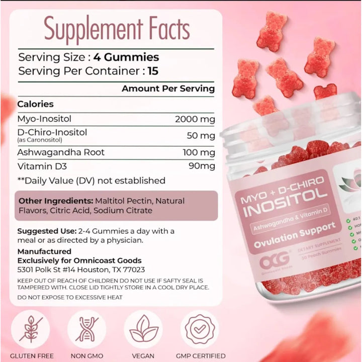 Estas gomitas no son solo un suplemento más; son tu aliado diario en el camino hacia la concepción. Formuladas con una proporción científica de 40:1 de Myo-Inositol y D-Chiro Inositol, están respaldadas por protocolos de fertilidad reconocidos. Además, la inclusión de Ashwagandha asegura que tu cuerpo y mente estén en armonía, reduciendo el estrés que puede afectar tu salud reproductiva.