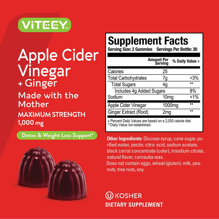 Estas gomitas no son un producto milagroso, son el resultado de una fórmula cuidadosamente diseñada con ingredientes puros y naturales. Cada bocado es una explosión de sabor a manzana que te hará olvidar que estás tomando un suplemento saludable. Pero lo mejor está en lo que no se ve: 1,000 mg de vinagre de sidra de manzana con "la madre" (esa poderosa fuente de enzimas y probióticos) y jengibre, un combo que trabaja desde dentro para desintoxicar tu cuerpo, acelerar tu metabolismo y mejorar tu bienestar general.