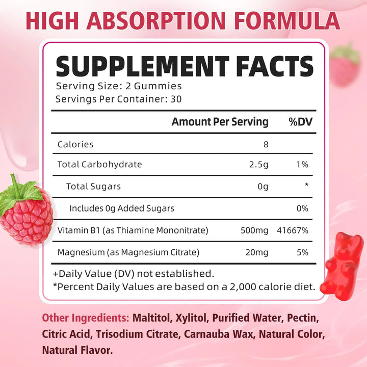 Imagina empezar tu día con la vitalidad que necesitas para enfrentar cualquier desafío. La vitamina B1 es esencial para convertir los alimentos en energía, y cuando se combina con magnesio, sus beneficios se multiplican. Ya sea que tengas una dieta alta en carbohidratos, consumas alcohol con frecuencia o simplemente busques un apoyo adicional para tu sistema nervioso, estas gomitas son tu aliado perfecto. Además, su delicioso sabor a frambuesa hace que incorporarlas a tu rutina diaria sea un placer, no una tarea.