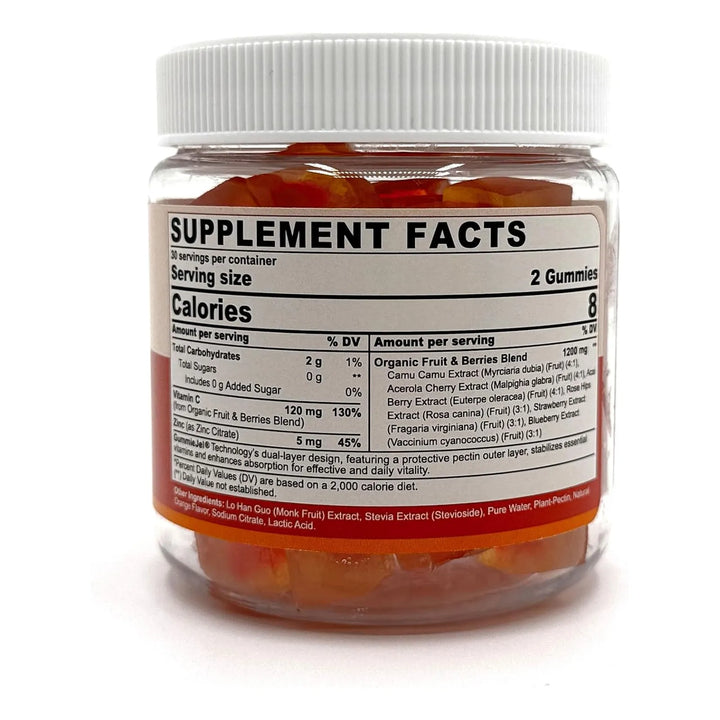 Estas gomitas utilizan vitamina C derivada de alimentos enteros (como bayas y frutas orgánicas), lo que garantiza una biodisponibilidad hasta un 30% mayor que las versiones sintéticas. Al consumirlas, los bioflavonoides actúan sinérgicamente con la vitamina C para neutralizar radicales libres, estimular la producción de colágeno y fortalecer las defensas inmunológicas desde la primera dosis.