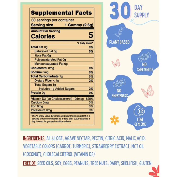 Imagina fortalecer tus huesos, mejorar tu sistema inmunológico y equilibrar tu estado de ánimo mientras disfrutas de un delicioso sabor a fresa. Estas gomitas de vitamina D3 orgánicas están diseñadas para adultos que buscan una solución práctica, deliciosa y efectiva para su bienestar diario. Con 5000 UI de vitamina D3 de alta potencia, cada porción te acerca a una vida más saludable sin sacrificar el placer.
