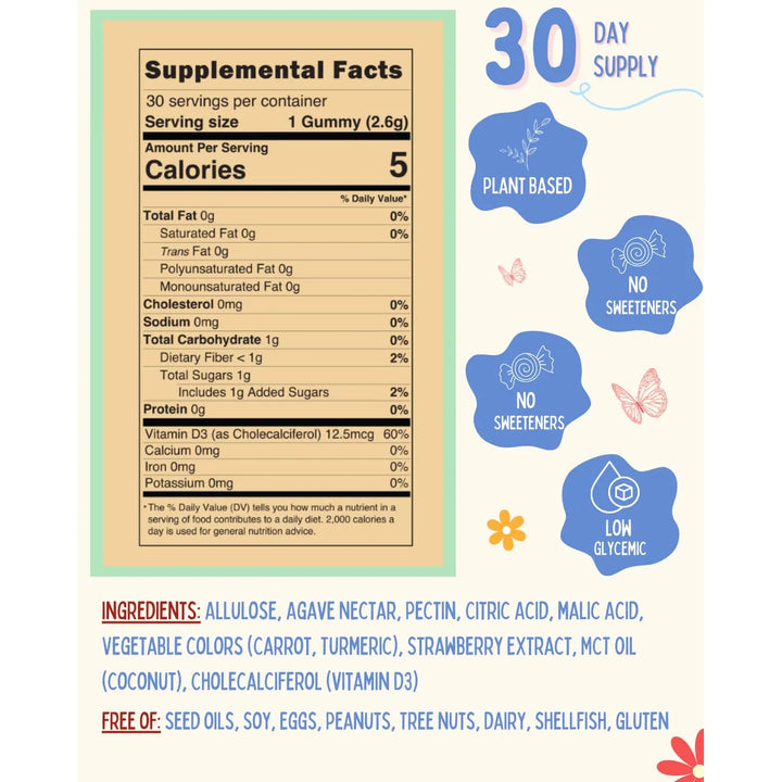 La vitamina D3 es un nutriente esencial que ayuda al cuerpo a absorber calcio y fósforo, fundamentales para el desarrollo de huesos y dientes fuertes. Además, juega un papel crucial en el sistema inmunológico, ayudando a combatir infecciones y enfermedades. Nuestras gomitas proporcionan una dosis óptima de 500UI en una fórmula fácil de tomar y digerir, especialmente diseñada para niños.