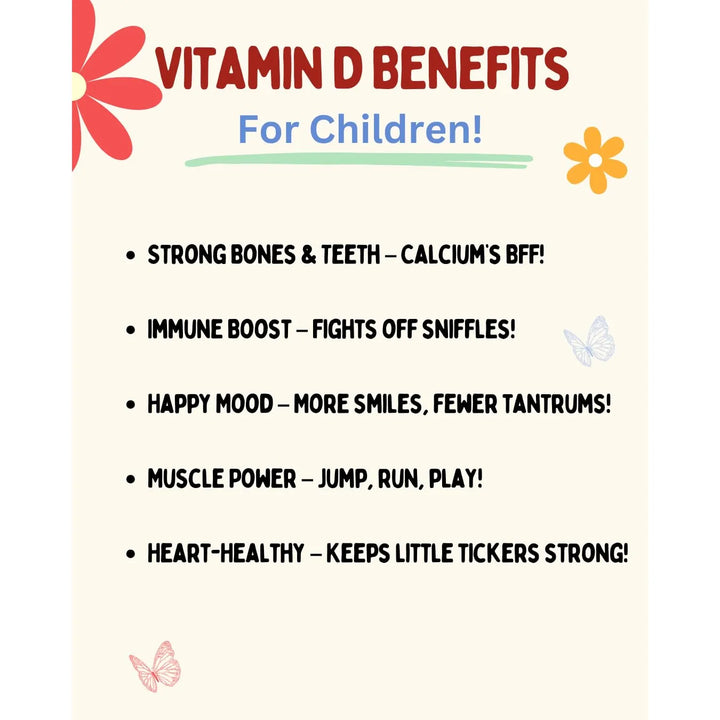 - 💪 Apoya huesos fuertes y sistema inmunológico saludable: La vitamina D3 es esencial para el desarrollo óseo y la función inmune, ayudando a tus hijos a crecer sanos y resistentes.