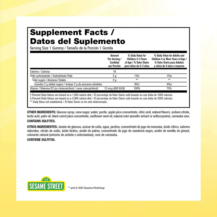 ¿Preocupado por la alimentación de tu hijo? Estas gomitas son 100% libres de gluten, lácteos, maní y gelatina, ideales incluso para dietas vegetarianas. No contienen colores ni sabores artificiales, solo nutrientes esenciales para apoyar el desarrollo de huesos fuertes, dientes saludables y un sistema inmunológico robusto. ¡Y lo mejor de todo! A los niños les encanta su sabor y sus personajes favoritos de Barrio Sésamo.