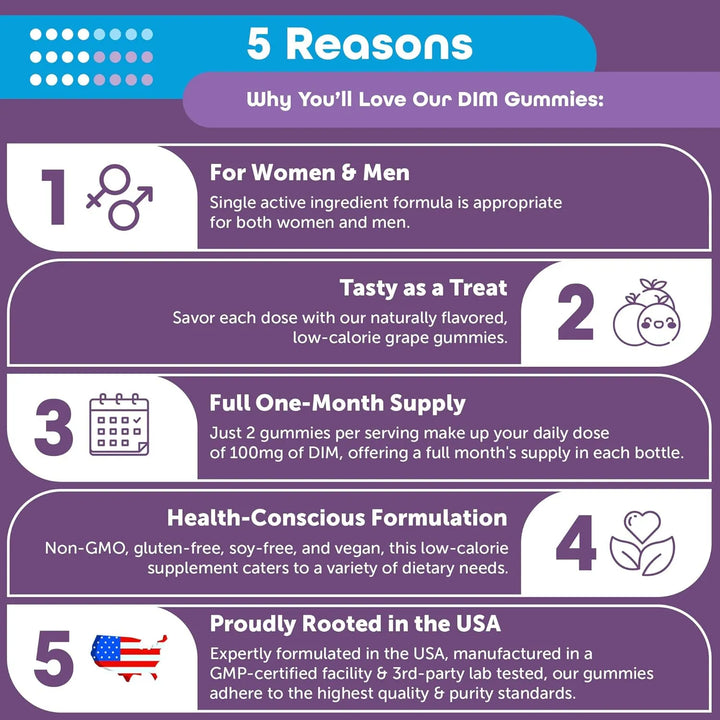 - 100 mg de DIM por gomita: La dosis óptima para apoyar tu equilibrio hormonal de manera efectiva 🎯.