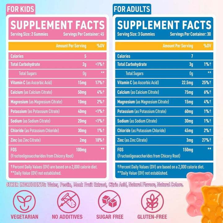 Estas gomitas están diseñadas para descomponerse rápidamente en la boca, permitiendo una absorción inmediata de electrolitos y minerales clave. La vitamina C y el calcio fortalecen tu sistema inmunológico, mientras que la oligofructosa (FOS) mejora tu digestión. ¡Todo en un snack práctico y delicioso!