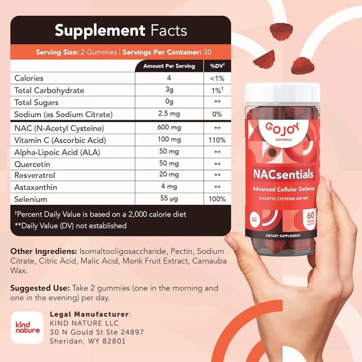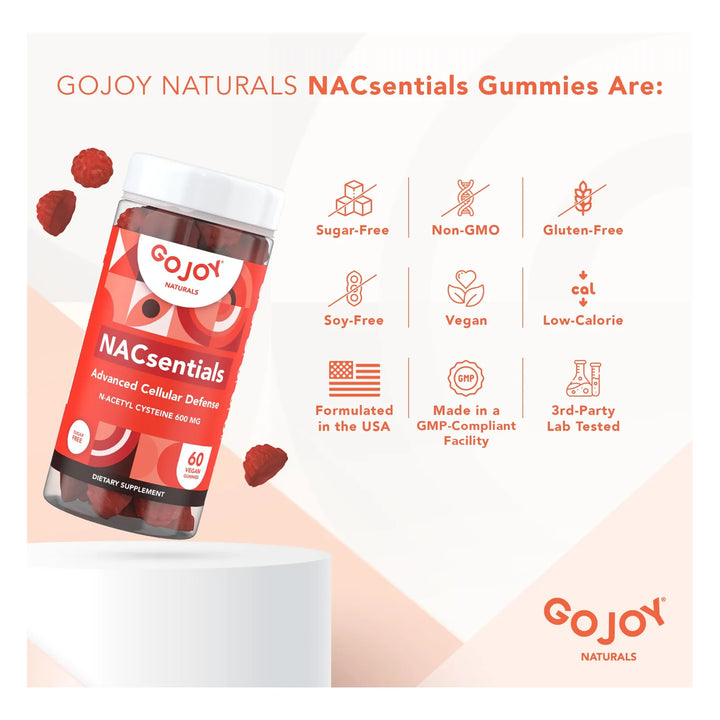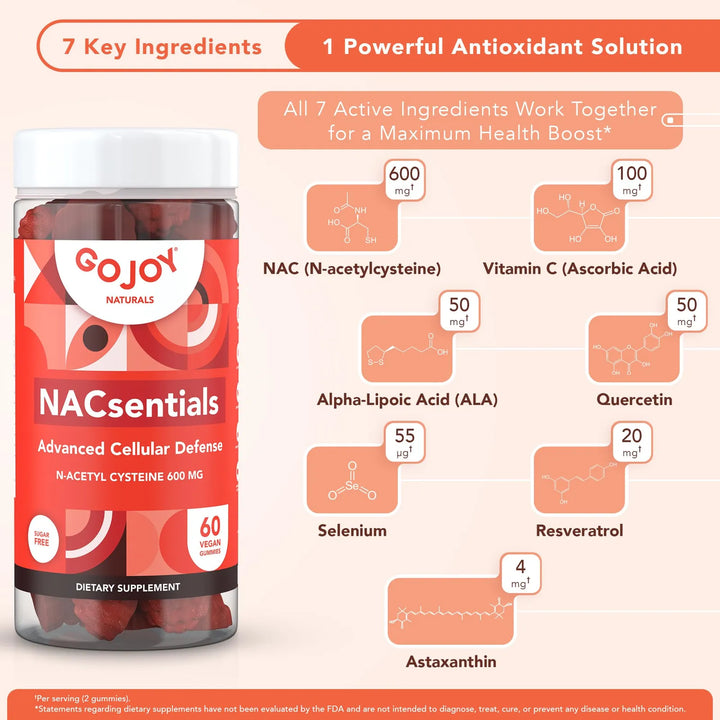 ¿Te preocupa el estrés oxidativo, la falta de energía o la salud de tu piel? Las gomitas GOJOY NACsentials son la solución que tu cuerpo está esperando. Imagina disfrutar de un suplemento delicioso, sin azúcar y lleno de ingredientes clínicamente probados que trabajan en sinergia para proteger tus células, desintoxicar tu hígado y revitalizar tu bienestar general. No se trata de otra vitamina aburrida; es una experiencia de cuidado personal que amarás cada día.