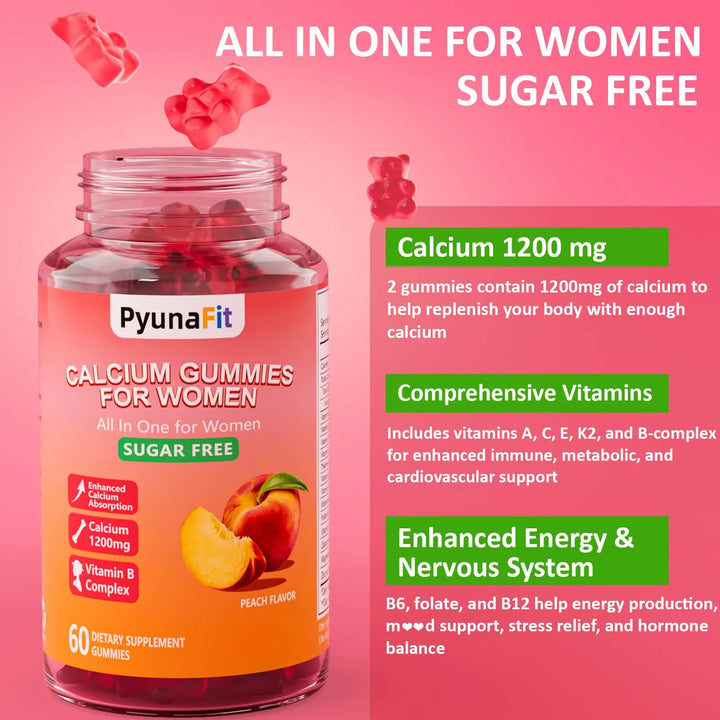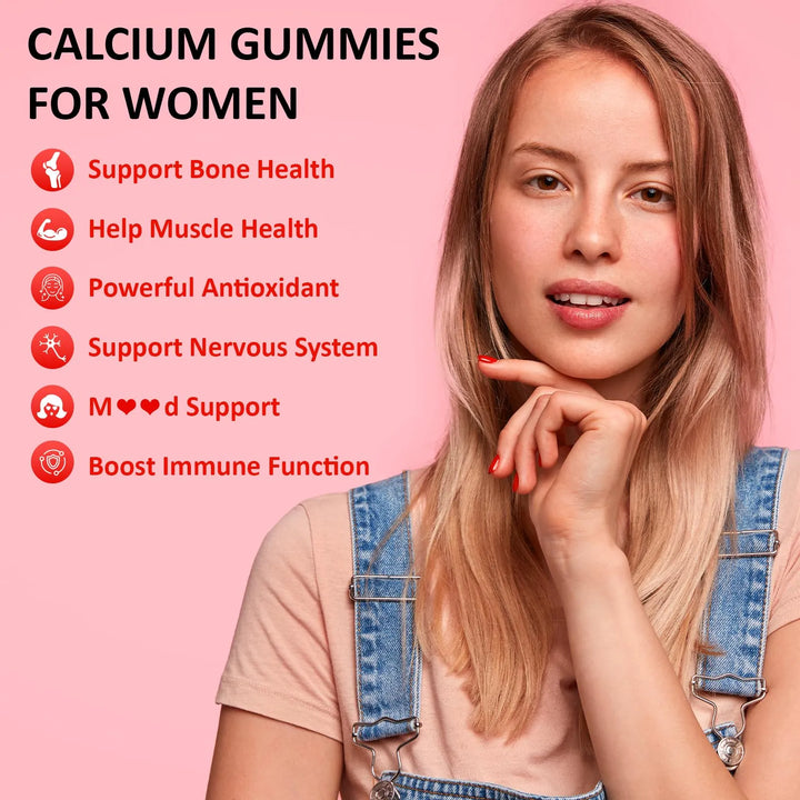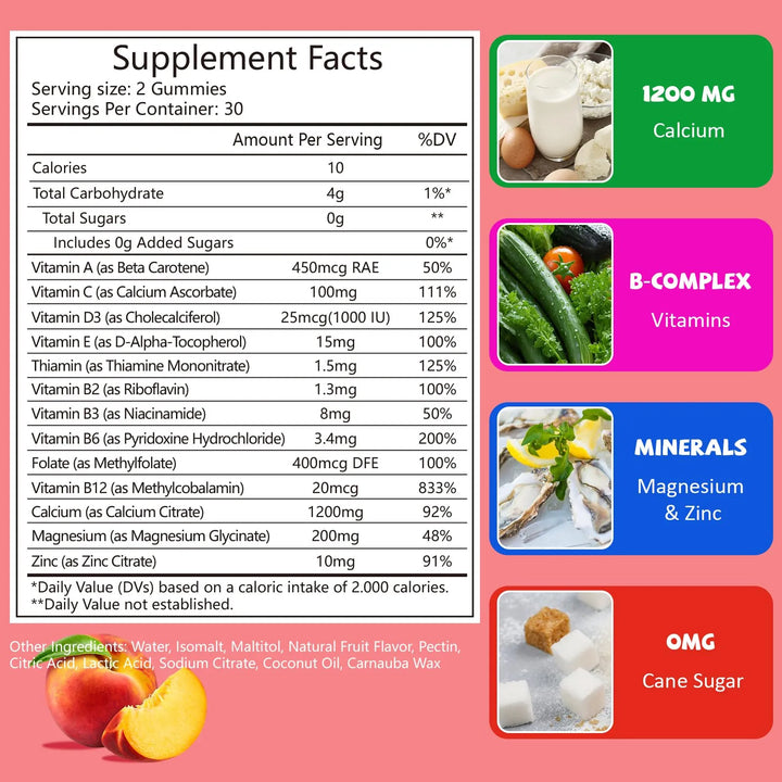 ¿Sientes que tu energía no es la misma de antes? ¿Te preocupa la salud de tus huesos y tu sistema inmunológico? Descubre las gomitas masticables de calcio 1200 mg, enriquecidas con vitamina D3, magnesio, zinc y más, diseñadas especialmente para el bienestar de la mujer. Con un delicioso sabor a melocotón y sin azúcar, estas gomitas hacen que cuidarte sea tan fácil como disfrutar de un dulce.