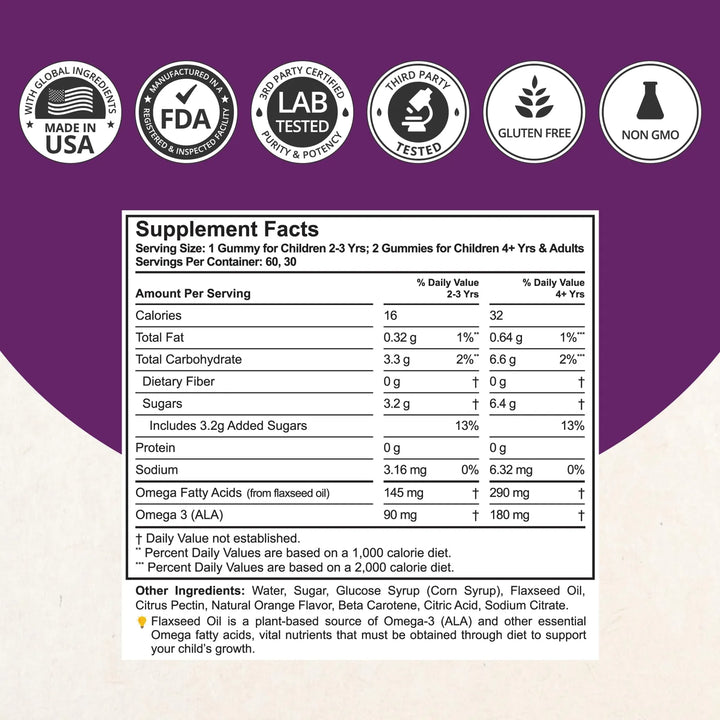 Las Gomitas Omega 3 con Aceite de Linaza están formuladas para proporcionar una dosis adecuada de Omega 3 ALA, un ácido graso esencial que el cuerpo no puede producir por sí mismo. Este nutriente es vital para el desarrollo cerebral, la función cognitiva y la salud ocular. Al consumir estas gomitas diariamente, tus hijos recibirán los beneficios del Omega 3 de una manera fácil y divertida.