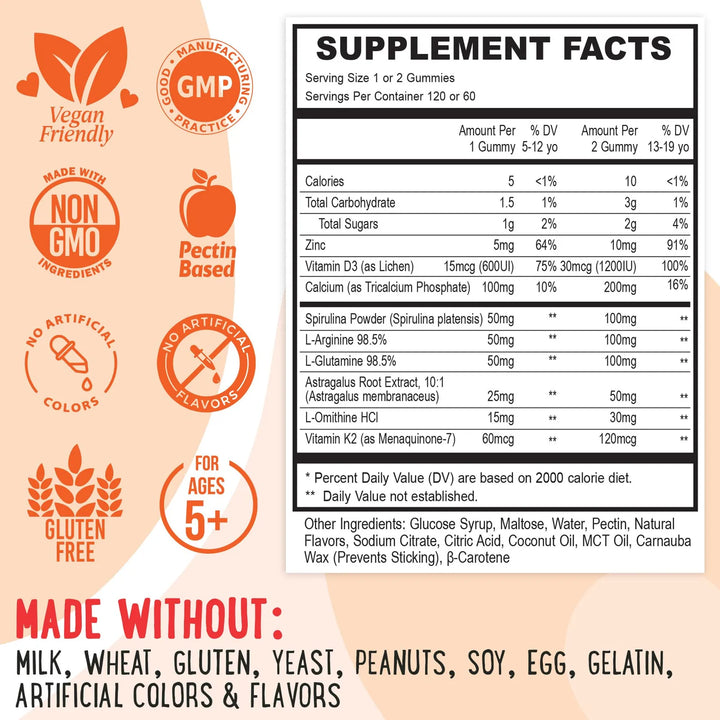 Nuestras gomitas trabajan proporcionando los nutrientes esenciales que el cuerpo necesita durante las etapas críticas de crecimiento. El calcio, combinado con la vitamina D3 y K2, asegura que los huesos reciban el soporte necesario para desarrollarse fuertes y saludables. El astrágalo y la espirulina refuerzan el sistema inmunológico, mientras que la L-arginina y la glutamina apoyan el desarrollo muscular y general.